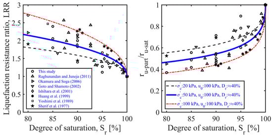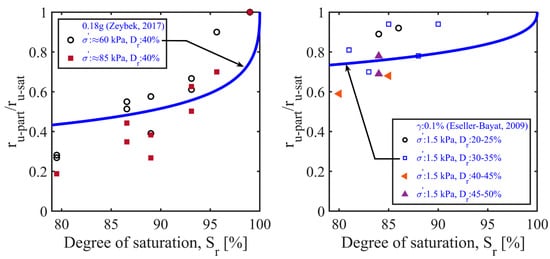 A group of experimental data was gathered from the literature through a comprehensive review of the elemental (e.g., undrained cyclic triaxial or simple shear) tests conducted on different types of sand with various degrees of saturation, effective confining stresses, and back pressures. The left window in Figure 16 shows the relationship between the liquefaction-resistance ratio and degree of saturation; this was obtained via an analysis of the test data from the present study and previous research. The right window in Figure 16 shows the normalized excess pore-pressure ratios () calculated using Equation (11) as a function of the degree of saturation. Figure 16 also compares the predictions of Equations (10) and (11) with the experimental data.