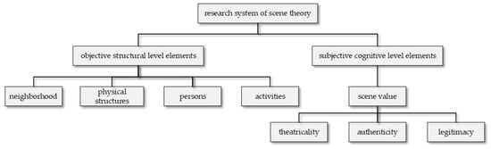 The term “scene” is widely used in many disciplines, including film and television, communication, and sociology. Initially, the term “scene” was used to refer to images in drama, film, and television. Later, the field of communication science introduced the concept of the “media scene” to emphasize a behavioral and psychological environment created by media messages. Robert Scoble and Shel Israel first combined scenes with the Internet, and in their book Age of context: Mobile, sensors, data and the future of privacy, they built mobile devices, social media, big data, sensors, and location systems together as the five technological forces of scenes, and predicted that the Internet would enter the era of scenes in 25 years []. As a result, the term “scene” has become familiar with the popularity of the Internet and is widely used in the field of marketing. In the field of sociology, Terry Clark of the New Chicago School was the first to use the term “scene”. According to Terry Clark, the scene is a holistic concept that includes five components: (1) neighborhood; (2) physical structures; (3) persons labeled by race, class, gender, education, etc.; (4) the specific combinations of these and activities; and (5) the value bred in the scene [,], as shown in Figure 1. As a new paradigm of urban research of the New Chicago School, the scene theory extends the study of urban space from the level of natural and social attributes to the level of consumption practice of regional culture. After their research on big cities, such as New York, Los Angeles, Chicago, and Paris, they found that different combinations of urban amenities will form different “scenes”, and different “scenes” contain specific cultural values, thus forming specific spaces and cultural connotations [].