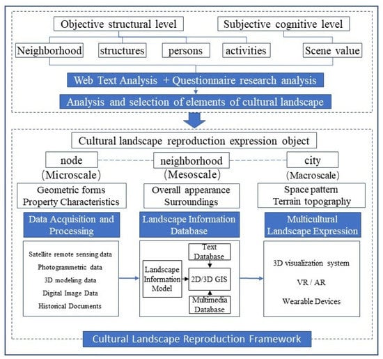 In the process of cultural landscape reproduction, data collection and processing are carried out first, including satellite remote sensing data, photogrammetry data, 3D modeling data, digital image data, and historical literature. Among them, satellite remote sensing data is obtained on Google Earth, and digital image data is obtained through online downloading and field shooting. Based on these data, we build 3D models of cultural heritage landscapes through the SketchUp platform. Then, a landscape information storage database is established, and 2D/3D GIS is constructed by integrating a landscape information model, text database, and multimedia database. Finally, visualization and creative expression of cultural landscape scenes are carried out with the help of 2D-3D visualization systems, virtual/augmented reality, and wearable devices.