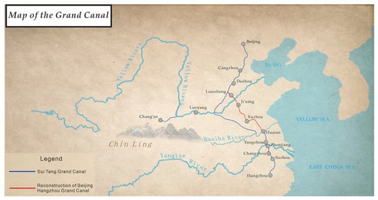 To show the geographical environment factors of the development and evolution of the typical religious and cultural landscape of the ancient city of Qingjiangpu, the history of the formation of the canal landscape of “South Boats and North Horses” is shown on the map, as shown in Figure 5.