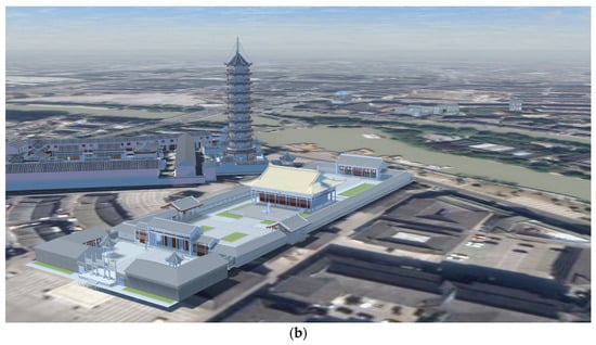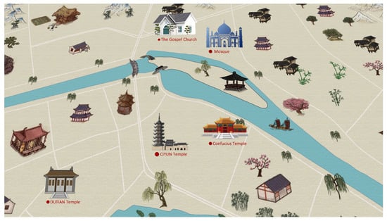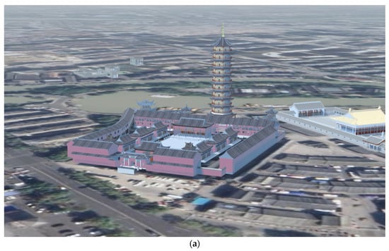 The integration of 2D maps and 3D spatial scenes is an important application of GIS. In the existing technical solutions, the 3D model is mainly used for spatial display, showing the visual effect of the spatial form and color appearance of the object. 2D maps are used to show the layout of the city. In practical application, the advantages of 2D GIS and 3D models are combined to achieve integrated expression. The overall appearance of the cultural landscape and the surrounding environment are presented using a 3D model and 2D remote sensing map overlay, showing the cultural landscape of “five religions converging” in the Qingjiangpu area in the context of “South Boat and North Horse”. The scenes visually show the natural and humanistic elements such as water systems, vegetation, roads, and residential areas. It is shown in Figure 6.