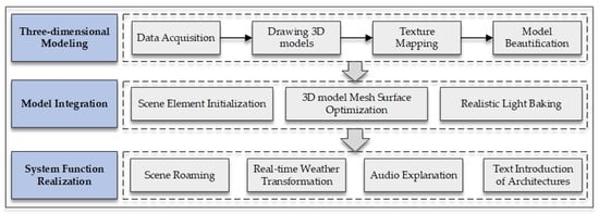 To show the cultural characteristics of the five major religious buildings in Qingjiangpu, this study is based on Unity 3D and C# programming language for system development, reproducing the geometric form and attribute characteristics of the religious building model of Qingjiangpu in full detail. The specific workflow was mainly divided into three parts: three-dimensional modeling, model integration, and system function realization, as shown in the Figure 7.