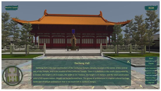 This study mainly reproduces the scenes of religious buildings in Qingjiangpu and shows the cultural characteristics and connotations of religious buildings, and realizes the following functions: full-scene roaming of religious buildings, real-time weather change, voice explanation, and architectural text introduction; the system interface is shown in Figure 8.