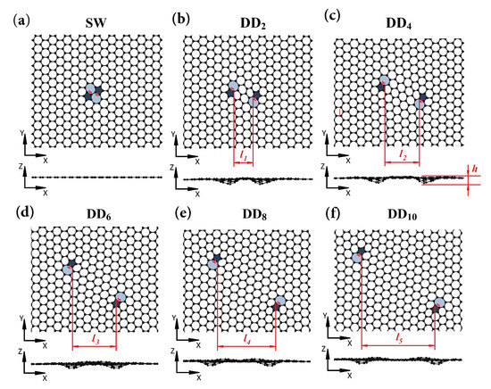 A dislocation dipole (DD) consists of two dislocations divided by the different distance which is the dipole arm l. The part of the simulation cell with the DD is presented in Figure 1 for each considered defect. Here, the orientation angle of the dipoles is , although it can be varied in a wide range [39]. The structures are named DD, where the subscript n indicates the distance between two 5–7 pairs in the hexagon units. The height h from the bottom of the basin to the top of the hillock changes as the distance between the two 5–7 pairs increases. The well-known SW defect in graphene may be viewed as a tightly bounded edge dislocation dipole in a 2D hexagonal lattice [39]. The Burgers vector of the dislocations comprising the SW defect and dislocation dipoles has magnitude , where a = 1.42 Å is the C-C spacing in graphene. Values of dipole arms and buckling height for DD are presented in Table 1.