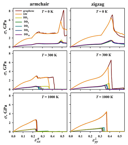 Temperature also plays a very important role in the degradation of the graphene strength with or without defects [48,49,50]. Thermal fluctuations drive the generation of atomic vacancies or dislocations since temperature increases the possibility of an atomic movement in the structure. For graphene, strength is considerably decreased by thermal fluctuations. Ultimate tensile strength and fracture strain of graphene under tension along armchair direction at room temperature is more than two times lower than at 0 K, while the further increase of temperature does not lead to a significant decrease of strength (see Figure 3a,b). Very similar results can be seen for graphene with SW. Elastic modulus E is almost not affected by the temperature increase, which is in line with the previous studies [51]. For tension along zigzag, the effect of temperature is not so significant. As can be seen, the increase of temperature considerably lower the of graphene and graphene with SW, while almost not affecting these values for graphene with DD.