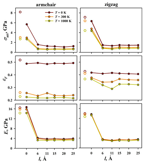 Figure 2 displays the course of the stress-strain curves for defect-free graphene and that featuring a number of different dislocation dipoles, under tension along armchair/zigzag orientations. For simplicity, all the values for tension along the zigzag direction will be defined by superscript z (zigzag) and, for tension along the armchair direction, by superscript a (armchair). All the critical values such as ultimate tensile strength , fracture strength and elastic modulus E for all considered structures under tension along armchair and zigzag direction are presented in Figure 3. Critical values for graphene under tension are shown by open circles. All the results are presented for three temperatures—0 K (theoretical strength), 300 K (room temperature), and 1000 K (finite temperatures). For a better understanding, both Figure 2 and Figure 3 should be described in connection with each other.