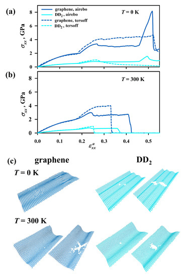 In Figure 4 another critical issue is presented—simulation of graphene tension with another interatomic potential for comparison: stress-strain curves during tension at 0 and 300 K for graphene and graphene with DD and snapshots of graphene after a fracture. Two interatomic potentials are compared—AIREBO and Tersoff. Tersoff interatomic potential is well-known for the simulation of physical and mechanical properties of graphene and other carbon structures [53]. As it is known, interatomic potential can considerably affect the simulation results [54]. As can be seen from Figure 4, before = 0.25 stress-strain curves are very close for graphene and graphene with the defects for both temperatures. Again, rippling is allowed in the model and it is the same as for structures simulated with AIREBO. Almost the same failure stress value for armchair and zigzag directions is obtained for Tersoff, which is not realistic. Tersoff also gives lower critical values of strain and stress. Fracture is brittle and it would be further compared with the snapshots of graphene simulated with AIREBO potential. However, for graphene in common, fracture occurs with the formation of carbon chains.