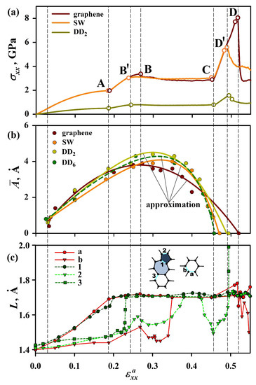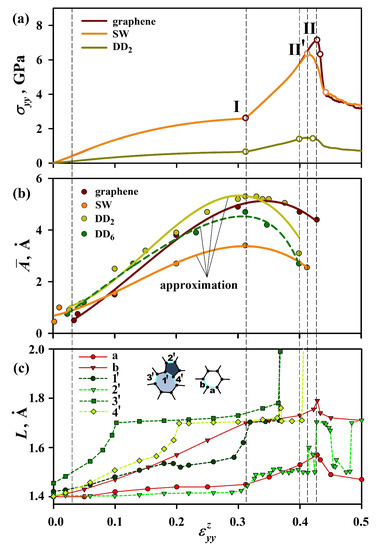 Different bonds in the structure are analyzed during tension for graphene, graphene with SW, and DD. In Figure 5c, changes of the bonds in graphene and graphene with DD have presented: two main bonds in graphene (a along armchair and b along zigzag) and three characteristic bonds near the dislocation—1, 2 and 3. Other different bonds in graphene are changing in a similar way to these three. To find equilibrium structures at different tensile strains and analyze the evolution of bond lengths, all structures are considered at 0 K. Small random perturbations to coordinates of all atoms with the magnitude 10 are introduced to check the structure for stability.