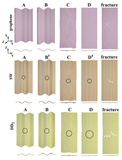 Snapshots of graphene, graphene with SW defect and with DD under tension along armchair direction at T = 0 K. Snapshots are presented in a perspective view and in a projection on plane. The defect is shown by a black circle. Corresponding dots A–D, B’, D’ are from Figure 5.
