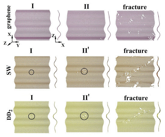 In Figure 7a, the comparison between stress-strain curves (a) for tension at 0 K along zigzag direction for graphene, graphene with SW and DD is presented in comparison with the average amplitude of ripples (b) and bond length (c) as the function of strain. For tension along zigzag, the situation is a bit simpler: only two stages can be found—before the point I and point II (II’ for graphene with SW and DD). Ripples did not disappear until the fracture and the elongation of graphene is much lower. From Figure 8 it can be seen that the length of the structure is not enough to obtain equilibrium ripples with the same parameters for graphene—there are three (at the point I) and two ripples of different amplitude. However, the presence of defects affects the ripple configuration and for graphene with SW and DD, ripples with close amplitude and wavelength appeared.