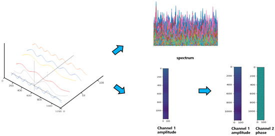 Data preprocessing is divided into three parts: effective signal screening, data normalization, and dual-channel data generation. First, each 100 ms data is segmented, and the signals in each data file are divided into effective signals, reference signals, and time slots, among which the effective signals are selected. Second, the individual fingerprint features of the emitter are independent of the transmitted power of the signal. In order to avoid the influence of the signal power difference, the data samples are normalized. Finally, in view of the particularity that the OFDM signal contains 108 subcarriers, each subcarrier will overlap with the image input, resulting in a poor effect. However, deep learning is mostly based on real number operation, which to some extent loses the intrinsic connection between IQ signals. As shown in Figure 4, in view of the OFDM signal, we first draw it into a spectrum diagram which is overlappedand then save the data value. The amplitude of IQ data is calculated as the first channel, and the phase is used as the second channel to generate single-channel dataset and two-channel dataset. New datasets generated in this way comprehensively utilize the amplitude and phase information of the IQ signal, and make full use of the internal connection between the two IQ channels.