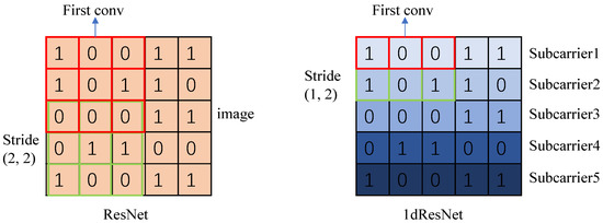 ResNet is usually used to extract the features of RGB images. There is a large amount of local information in the images, but each line of OFDM signal represents a subcarrier with timing information inside. Therefore, it is more reasonable to use 1-dimensional convolution and adjust the step size in OFDM data.