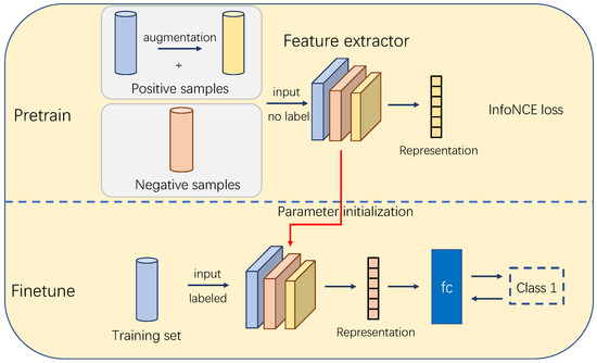 Contrastive learning and residual network framework. (1) In the upper part, we conduct pretraining based on contrastive learning, we perform data augmentation to generate positive samples, and the feature extractor is the residual network without FC layer. We use the InfoNCE loss function in this part. (2) In the bottom part, we initialize the feature extraction layer of the residual network with the pretrained model’s parameters, and the loss function is cross-entropy.