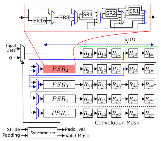 An example of generating a maximum window size and capable of obtaining a one is shown in PLB output in Figure 4. Although the depicted PLB case is for or generation, the design has the processing capacity for any combination of filter sizes (scalable architecture) by adding the required derivations. Components in blue indicate the configurable data paths used to control the mask sizes. Firstly, the pixels of the input image are stored in FFD , and then the data are clock-synchronously moved to the right-located register (depicted arrow flow direction). The data path in multiplexers for generating a convolution mask in to are defined through the control module when . In the processing of a new convolution layer, both w parameter and the size of the input feature map are programmed. The subsequent value is smaller in lower layers than in higher ones. The PSR comprises several shift registers in cascade where data are transferred or skipped depending on the number of feature map columns being processed. The length of each shift register is laid out in powers of two; thus, for instance, when and , shift registers SR16, SR8, SR2 and SR1 must be used. The control unit is notified by a synchronizer when a valid to-be-processed convolution mask was generated within the PLB. Such operation is completed depending on the P and S values; for instance, when , the PLB is filled up with zero values, hence the image data are not read from the input RAM memory.