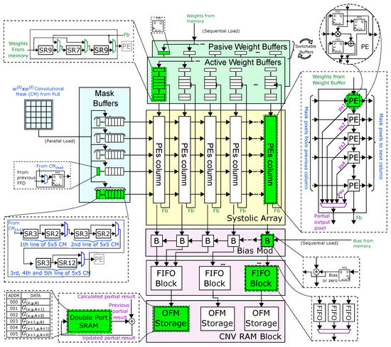 The block diagram of the proposed flexible SA is depicted in Figure 5. When a valid convolution mask is generated by PLB, Mask buffers (MB), which serve as row inputs for the SA, concurrently receive the reshaped masks. The number of SA rows determines the number of masks to be parallel processed (); thus, each mask is transferred to each MB as the PLB generates them. Once the MBs are full, the general control should stop entering data into the PLB until the processing in the SA is finished. Previously, the filter coefficients must be loaded as shift registers sets, called Passive Weight Buffers (PWBs), in order to start the processing when the data content of MB is complete. When the PWB registers are filled, they are transferred to new registers called Active Weight Buffers (AWB). The purpose of performing this transfer is to be able to operate on the values stored in the AWB while the PWB is being loaded with new coefficients. This ping-pong strategy reduces processing latency and dead time.