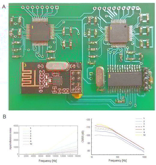 The main focus was on the choice of the analog front-end (AFE), which supports a maximum number of channels with a high resolution for measurements of EEG and electrocardiogram (ECG) signals and good noise reduction capabilities. The AFE design enables the initial acquisition of analog biosignals by electrodes and their digital conversion (Figure 1 and Figure A1).