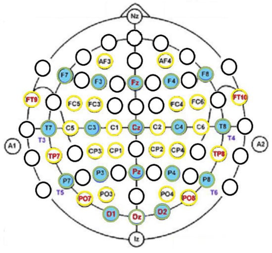 The 40-channel EEG placement was according to the standard 10-20 and 10-10 systems [31,32] and separated sensors for the ground, sensors placed on the forehead, and reference sensors in both mastoid processes (Table 3 and Figure 4). The stretch cap held the 40 embedded sensors that were prepositioned in the international montages, which minimized electrode placement errors through measurements (10% and 20% as well as 10% and 5%) of the distances between the skull landmarks along the midline from the nasion (Nz) to the inion (Iz) and from the left to the right pre-auricular points (A1 and A2, respectively) correctly aligned in the horizontal and vertical planes with placement Cz. The EEG sensors (10-20: Fz, Cz, Pz, O1-O2, and Oz; 10-10: FT9-FT10, TP7-TP8, PO7-PO8) for the NF experiment are underlined in Table 3. Their choice was according to the functional connectivity studies [6,7] of the typically developed children. We hypothesized that qEEG z-NF may lead to a functional reorganization in DD children that consists of a reduced interhemispheric low-frequency theta band and an increased alpha band in the regions involved in the reading network in the temporal lobe, occipital cortex, and those which intervene in the articulation and gesticulation of words as frontal and precentral cortices.
