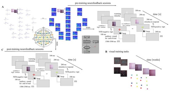 Scheme of experimental set-up. (A) EEG signals and frequency analysis at the EEG signals. Presentation of pre-training neurofeedback sessions: six sessions (for each hemisphere). (B) Visual training (VT) tasks, described in Supplementary Materials. (C) Post-training neurofeedback.