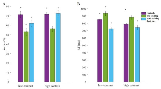 Statistical comparisons (Kruskal–Wallis test, p < 0.05; marked with stars): (A) success (%) and (B) reaction time (RT).