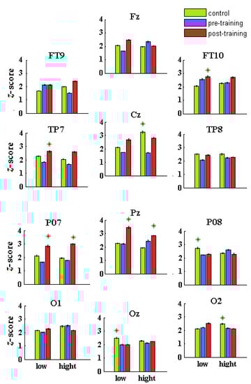 The α/θ scores of all post-training dyslexic sensors were significantly higher relative to the correspondent sensors of the preD group (postD vs. preD: p < 0.008, χ2 > 7.02; Figure 7 and Table 4). There were no differences at the occipital and temporal cortices between the preD and postD z-scores at O1 and FT9-FT10 (low) and at TP8-O2 (high contrast).