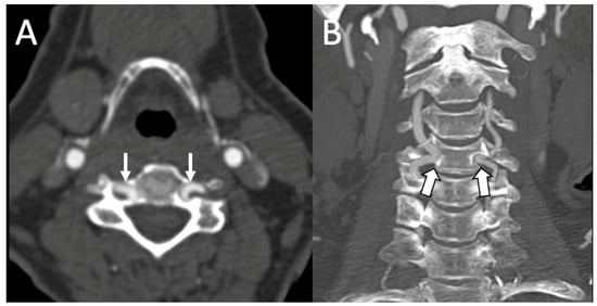 (A) An axial CT angiography image shows medial migration of the vertebral arteries bilaterally at C4 (arrows). The distance between the medial wall of the vertebral artery on either side and the midline of the cervical vertebra is 7 mm. (B) Coronal maximum intensity projection image shows the medialization of the vertebral arteries at this level compared to other levels (arrows).