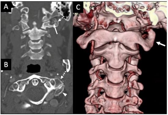 (A) A coronal CT angiography image using the bone window shows left paracondylar process with the left vertebral artery (arrow) within a canal formed by an enlarged lateral mass of C1 (dashed arrow) merging with the occipital condyle. (B) A paracondylar process is seen in another patient in the axial plane with an enlarged left lateral mass of C1 (dashed arrow) articulating with the left occipital condyle (arrowhead). (C) 3D reconstructed image shows the paracondylar process on the left side (arrow).