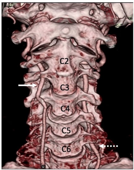 The vertebral arteries (VAs), critical blood vessels of posterior brain circulation, can exhibit a variety of anatomical variations which have an important implication in medical procedures, specifically in the context of spine surgeries [,]. During cervical spine surgeries and endovascular interventions, the VA is at risk of injury due to its close relationship to the vertebrae and the presence of anomalies, such as variant origin [,,], unusual entrance [,,,,], and course in the cervical spine [,], hypoplasia [], and tortuosity []. These anomalies make it more difficult to identify and access the VAs during surgeries and may lead to inadvertent injuries, which can have detrimental consequences for patients []. Therefore, these injuries need to be prevented. Research into a comprehensive understanding of the different types of VA anomalies and their clinical impact could help clinicians find patients who are at risk for VA injury during surgery, choose the best surgical approach, and improve patient clinical outcomes.