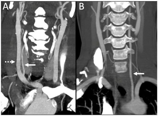 (A) A coronal CTA maximum intensity projection image shows the right vertebral artery (solid arrow) originating from the right common carotid artery (dashed arrow). Right-sided UE-V2 variant is also present in this patient. (B) The left vertebral artery is seen arising from the aortic arch in another patient (arrow).