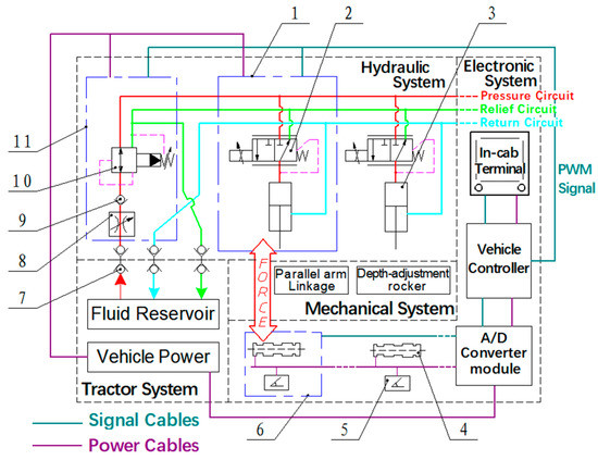 As shown in Figure 2, the whole machine system is divided into three parts: mechanical system, electric control system and hydraulic system. Among them, the mechanical system consists of four-bar linkage, a depth-limiting mechanism, a sowing depth adjustment mechanism, etc.; the electronic control system consists of a load pin, vehicle controller, vehicle display terminal, etc.; the hydraulic system consists of an integrated pressure-reducing cylinder, a main circuit valve group, etc. The tractor system is an external auxiliary system, in which the vehicle power supply provides power for the electronic control system, and the hydraulic oil tank provides the pressure source for the hydraulic system.