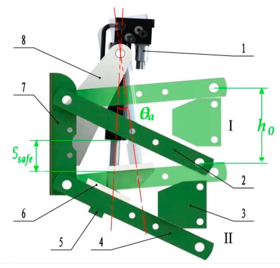 According to the design principle of the profiling mechanism and the structure of the 470B row unit, we designed the cylinder bracket and the cylinder press plate. The cylinder bracket is connected with the top plate for clamping the top of the cylinder, and the cylinder press plate is connected with the original spring tie bar through bolts for mounting the bottom hole of the cylinder. The spring tie bar position, i.e., the cylinder iso-effective arm Lf1, is 105 mm, and the profiling ratio Lf1/Lf is 0.3. Due to the profiling of the space structure of the four-bar linkage, the safety stroke Ssafe of the cylinder is initially set to 55 mm in combination with the field conditions and usage scenarios, and the lower limit is used as the design benchmark, and the optimized total profiling range h0 is 183.3 mm, calculated by the profiling ratio Formula (6). As shown in Figure 4, the relative positions of the upper and lower limits of the four-bar linkage are shown. The piston rod of the cylinder is not fully extended when the profiling mechanism reaches the maximum profiling lower limit, and the upper and lower profiling angles α1 and α2 are 10.5° and 20°, respectively, and the upper and lower profiling ranges are 63.6 mm and 119.7 mm, respectively, which meet the design requirements of the profiling mechanism profiling range.