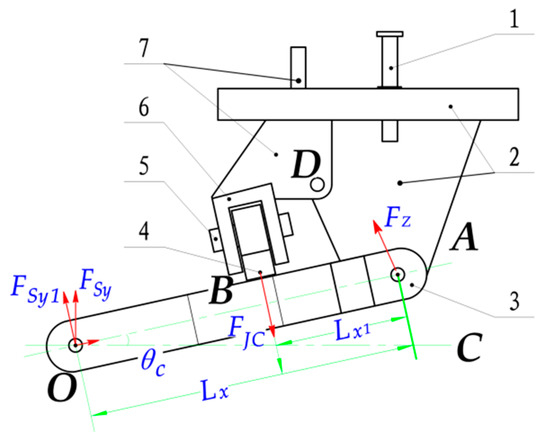 where FJC is the depth-limiting contact force, the contact force between the depth-limiting block and gauge wheel arm, and the direction is always perpendicular to OA, N; FSy1 is the fractional force of FSy in the vertical OA direction, N; Lx is the effective length of the gauge wheel arm, mm; Lx1 is the length of the force arm of FJC on OA, mm; and θc is the angle between the gauge wheel arm OA and the horizontal plane, °.