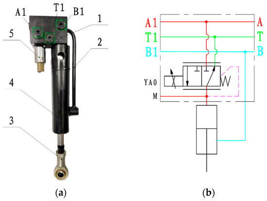 (a) Diagram of the IPRC, (b) IPRC schematic: (1) valve block, (2) return pipe, (3) piston rod, (4) cylinder, (5) cartridge-type pressure-reducing valve.