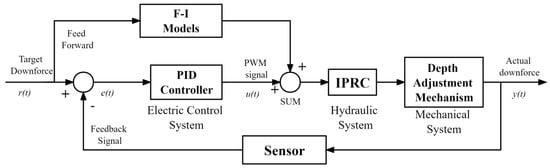 Due to the signal time lag, hydraulic system nonlinear changes and the presence of inertial loads on the machine, we introduced a PID closed-loop control algorithm that can be better adapted to complex field environments. In addition, based on the feedback PID regulation, a feedforward compensation algorithm is introduced to superimpose the fitted F-I model with the PID output, which can converge to the target downforce faster and make the system enter the steady-state quickly. The closed-loop PID depth control system with feedforward compensation is shown in Figure 8.