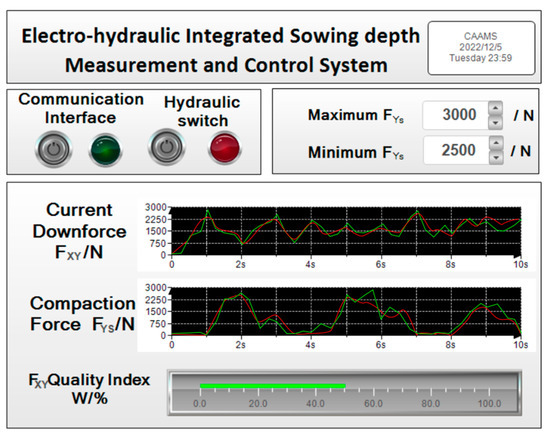 Bai et al. [31] comprehensively analyzed the control process of the sowing depth and compaction and designed the control system of the downforce and closing force based on hydraulic regulation. The user interface was built to allow the user to adjust and monitor the current downforce and closing force of the system in real time.