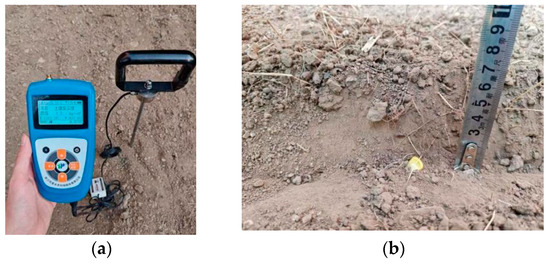 Field tests. (a) Soil compaction measurement; (b) sowing depth measurement.