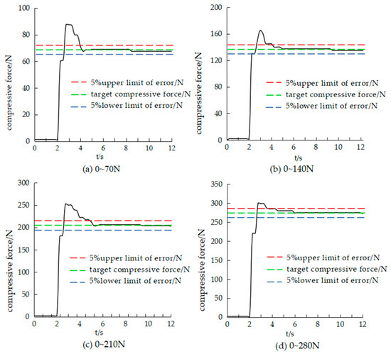 - The step response test results show that when the target compressive force is in the range of 0~280 N, the steady-state error of the system response is less than 10. When the target compressive force is 280 N, the adjustment time and rise time are at a maximum, 6.1 s and 0.64 s, respectively. The overshoot range of the four tests is 18.7%~26.6%, and the average value is 21.8%. The range of the steady-state error is 6.2~10.7, the average value is 8.63 and the error is within 10% when the system is stable.