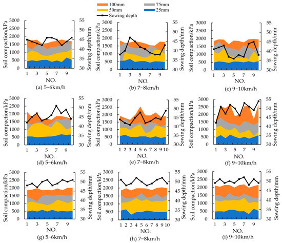 Figure 15 shows the sowing depth measurement data of three vehicle speed levels under three types of downforce regulation. In order to reduce the error, the mid-range measurement data of each vehicle speed were selected. The one with the best sowing depth was selected as the comparison data among the two sets of mechanical spring adjustment data. As shown in Figure 15, the black line is the sowing depth data, and the stacked area graph is the soil compaction data after sowing. Although the test machine has high profiling accuracy for homogeneous profiling, there will be profiling advance and lag due to the terrain, so a small amount of measured sowing depth data will slightly exceed the set sowing depth h.