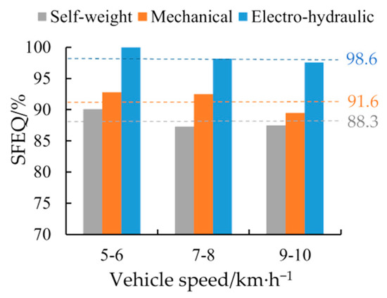 The seed groove environmental qualification rate (SFEQ) reflects the contact effect between the seeds and soil in the seed bed, including two important indexes of the sowing depth and seed groove compaction. According to the criteria for determining the qualified seed groove environment in Section 2.5.1, the data in Figure 15 were extracted and calculated to obtain a comparison chart of the SFEQ under three regulation methods, as shown in Figure 16.