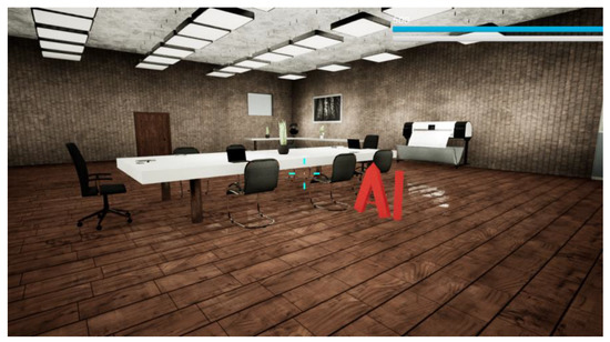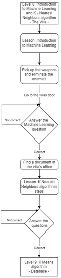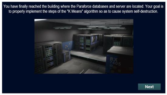 Level 8 (see Figure 19): In this level, the player is introduced to Machine Learning and its types. He is initially informed that he/she is in the fourth of the buildings he/she found in level 6, which is a small cottage of the Paraforce leader. The player is further prompted to proceed toward the entrance of the house to breach the alarm. After being educated on the concept of Machine Learning and its types, the player proceeds to the door, where answering a Machine Learning-related question disables the alarm. After entering the house and defeating the enemy NPCs, the player proceeds to the library where he/she finds a document containing information about the target building where the Paraforce databases are housed. After first being trained on the K-Nearest Neighbors algorithm, the player applies its steps to find the building with the servers.