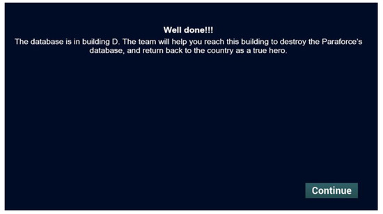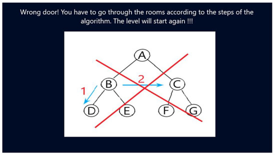 When the player makes a mistake while applying the algorithm, feedback is provided. The player is presented with a message with the mistake he/she made, and the level is restarted, as it is assumed that the player has not fully understood the algorithm. For example, suppose the player is asked to traverse a series of rooms according to the steps of the Breadth First Search algorithm. In case the player has not crossed all the rooms of the N level of nodes–rooms and passes to N + 1, he/she will see the error message presented in Figure 6. As soon as the player completes a task, a confirmation message appears (Figure 7), which also informs him/her about the continuation of the scenario.