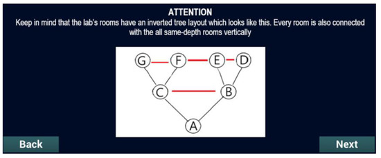Tasks of correctly traversing areas of the map: Here, the player, after studying the theory of each algorithm, enlists his/her spatial intelligence to apply the steps of the algorithm while traversing the specially configured areas. For example, at the level corresponding to the Depth First Search (DFS) algorithm, the player is first informed by the message of Figure 8 about the tree arrangement of the rooms of the space and then asked to apply the steps of DFS in order to find the exit, proceeding then to the next level. In Figure 9, we see a view of room A (node A) which provides access to rooms B and C (nodes B and C).