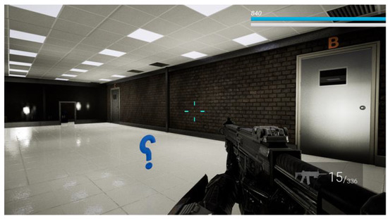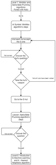 Level 7 (see Figure 18): The player is in a forest similar to Level 2 but this time filled with huts. Here, the player is trained on the Mini–Max algorithm. As soon as the player learns the steps of the algorithm, he/she is informed that there is no weapon available. To be able to acquire weapons, the player must visit the huts in which, after solving the problem of the Mini–Max algorithm contained in each one, he/she will have the possibility to acquire one of the four available weapons so that he/she can defend himself/herself from the attacking NPCs. As shown in Figure 10, the arrangement of huts in the forest is tree-like, and each hut corresponds to a node from A to G. When the player reaches the last hut, he/she is informed that he/she may have left footprints in one of the previous huts. After first being trained in the steps of the Alpha Beta Pruning algorithm, he/she applies them to find the dangerous hut and blow it up so that his/her footprints are lost.