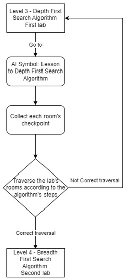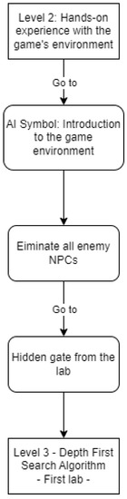 Level 3 (see Figure 14): The player is inside the first chemical laboratory of Paraforce in which he/she must first defeat the enemy NPCs and manage to find the exit. In this level, the player learns the Depth First Search algorithm based on the steps of which he/she has to cross the lab areas.
