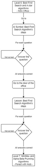 The axis of learning content modeling refers to issues of syllabus matching and possibilities of scaffolding for comprehending the syllabus. In the following, we present for each level of the game the algorithms that the player is trained in, the number and the kind of activities included in it and how they relate to the game scenario, along with a game flow map. The algorithms presented in the game are considered to be fundamental in the field of AI and are essential for developing intelligent systems that can reason, learn, and make decisions. In addition, these algorithms are taught in higher education through various courses and applied by students in many assignments. An additional reason for the selection of this set of algorithms is that their steps can be easily represented graphically and thus become easier to understand.