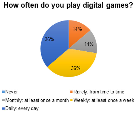 In Figure 21, the participants’ game-play habits are presented. All the participants play digital games with the vast majority of them playing digital games daily (36%) or weekly (36%), which is a fact that strengthens the potential of using games for educational purposes as well. Moreover, the familiarity of the participants with entertainment games along with their interest in programming constitutes the sample ideal for evaluating both the player experience and perceived short-term learning in SpAI War. Since almost all the participants were experienced videogame players, we anticipated that they would easily highlight problematic issues regarding player experience and the scenario of the game. Moreover, due to their field of studies and their interest in programming, we anticipated that the participants would be able to locate potential problems with the educational material and tasks and the way they were interleaved with the game mechanics and the scenario of the game.
