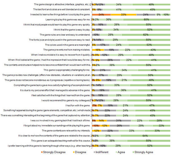The scenario plays an important role in the success of a game whether it is an entertainment game or a serious/educational game [10,31,32,33]. Although the scenario has an impact on various aspects of the player experience quality factor as defined in the MEEGA+ model, such as focused attention, challenge and fun, we decided to directly investigate the participants’ perceptions on the scenario of SpAI War. In Table 4, the median is presented for all the statements/questions on students’ perceptions on the scenario of the game, while in Figure 25, the corresponding percentages for each level of agreement per question are presented.