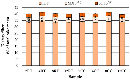 The content of IDF was not affected by the grinding process and particle size reduction, while it significantly affected soluble dietary fiber (SDF) (Figure 1). The amount of SDFP was significantly affected by the grinding time and the interaction of grinding time and temperature. According to the Tukey test, their amount increased with increasing grinding time until 8th minute, both with and without cryogenic cooling, and then decreased after 12 min. Samples ground for 12 min contained significantly lower amounts of SDFP than samples prepared in shorter procedures. The increase was also observed by Liu et al. [46] on an orange peel. The reason could be the release of soluble fibres from stable complexes with a longer grinding time, while further grinding leads to mechanical destruction of the molecules and consequently to a decrease in their amount. This hypothesis is confirmed by the fact that the number of SDFS increased slightly (by about 8%) after 12 min of grinding with cryogenic cooling. Both SDFP and SDFS were significantly affected by the duration of the grinding process, but SDFS were also affected by the temperature of the process, with cryogenic grinding yielding a slightly higher value. Čukelj Mustač et al. [14] also reported an increase in SDFS of millet bran with decreasing particle size.