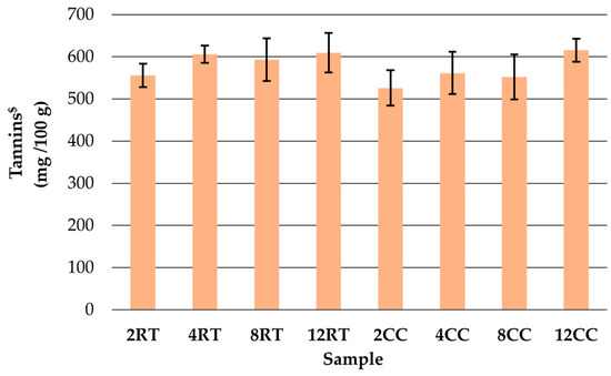 The changes in tannin concentration in ground rapeseed cakes are shown in Figure 2. According to the results, the initial rapeseed cake contained lower amounts of tannins (Table 2) than all other samples. The results show that a longer grinding time improves the extractability of tannins (p ≤ 0.05). It is observed that better extraction is obtained at higher temperatures, but the grinding temperature was not found to be significant. Tukey test also showed that there was no significant difference in tannin concentration between samples. Similar to phenolic compounds, tannins are also released from their complexes by cell disruption.