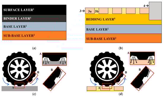 Interlocking Concrete Block Pavement (ICBP) and Asphalt Pavement (AP) in terms of layers and contact with the traffic load (adapted from []). 1 Asphalt concrete (AC); 2 Continuously graded aggregates; 3 Surface layer; 3a Concrete paving blocks (CPBs); 3b Joints’ material; 4 Lateral confinement at the edge of the shoulder or at the sidewalk; 5 Controlled sand material. (a) AP layers, (b) ICBP layers, (c) AP surface layer, (d) ICBP surface layer.