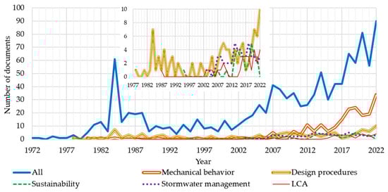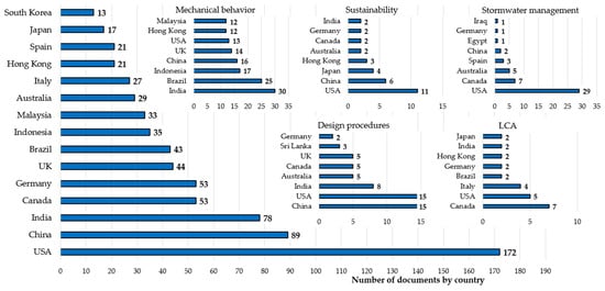 This paper aims to review the performance analysis of ICBP with by-products, such as coconut fibers and recycled materials from CDW, and to compare the skills with AP, especially for light-traffic urban roads applications. For this aim, the authors analyzed the studies published on the Scopus search engine (www.scopus.com) related to ICBP. This tool was used by searching in the article’s title, abstract, and keywords with the following query string: (“concrete” AND “paving” AND “blocks”) OR (“interlocking” AND “pavements”). The search provided 1125 documents from 1972 to 2022, separated into six groups: 1. mechanical behavior via mix parameters or the influence of by-products; 2. sustainability via the heat island effect (HIE) or contaminants concentrations; 3. stormwater management; 4. design procedures; 5. LCA, and 6. others. Figure 2 and Figure 3 show the queries’ outcomes by year and country, respectively. The main direct inferences were as follows. 1. Research efforts that considerably increased after 2002; 2. Stormwater management, sustainability, and LCA applied on ICBP began to have more visibility only after 2006, 2012, and 2015, respectively; 3. The US and China are the countries that have contributed the most to the number of documents on ICBP; and 4. Apart from the US, only Canada has published documents on the three most recent ICBP knowledge areas: stormwater management, sustainability, and LCA.